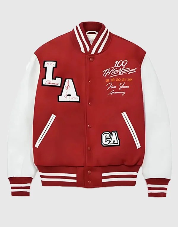 thieves 5 year anniversary 100t red and white varsity jacket