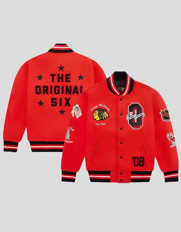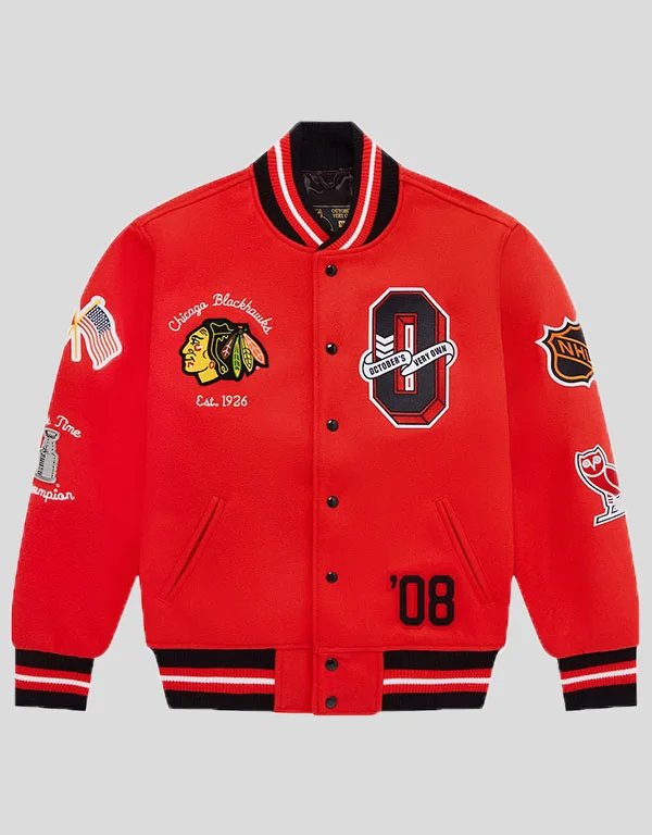 Home » Shop » OVO x NHL Chicago Blackhawks Red Varsity Jacket