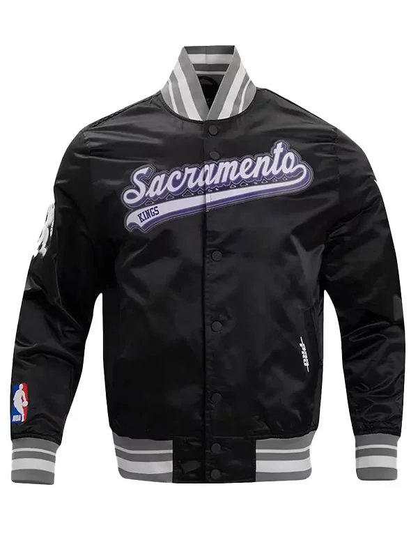 Home » Shop » Sacramento Kings Script Tail Black Varsity Satin Jacket